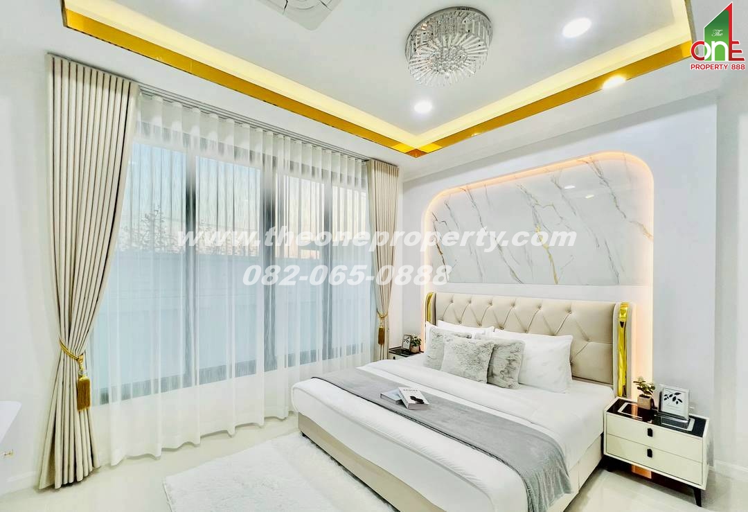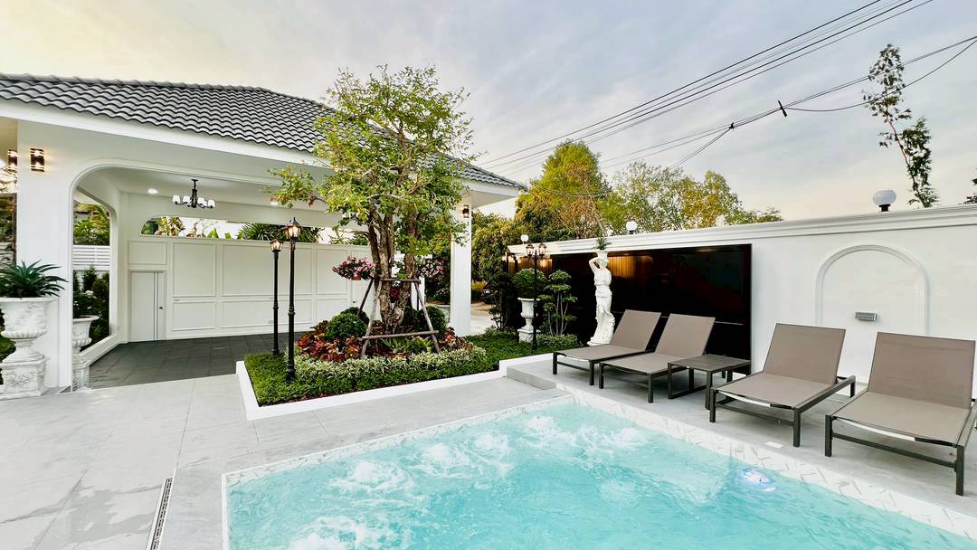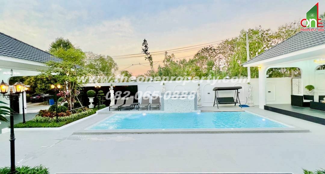 การตกแต่ง :Modern luxury Pool Villa พท.ใช้สอย 864 ตรม. พูลวิลล่าชั้นเดียว 5 ห้องนอน 6ห้องน้ำ 1ห้องครัว 1ห้องเก็บของ 1 ศาลานั่งเล่น สระน้ำ 4.5 x 10.5 ม.